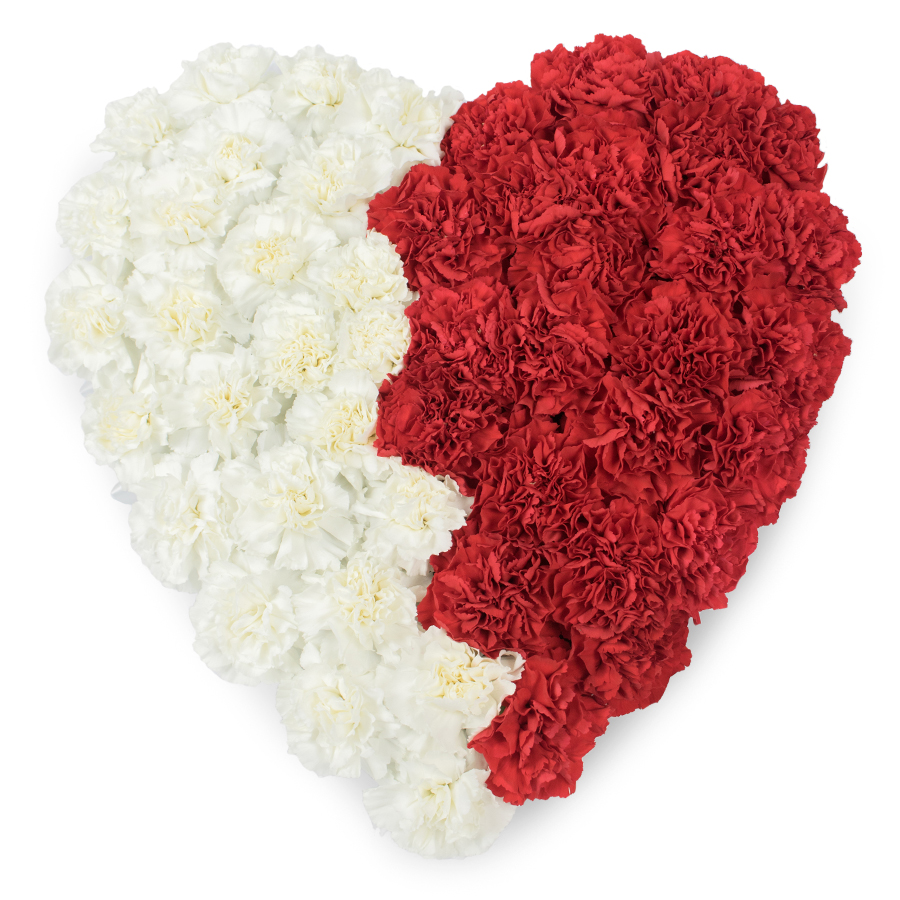 Our exquisite heart-shaped bouquet showcases a stunning combination of white and red carnations, expertly arranged to symbolize love and sympathy. Each flower is hand-selected for its freshness and superior quality.